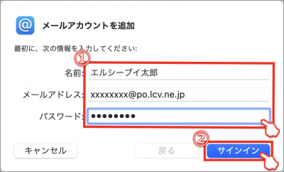 | ユーザー名 | 「LCV-Net会員証」「拡張サービス登録証」に記載されているメールアドレス、またはお客様にて変更されたメールアドレス **ご注意** 「受信用メールサーバー」を入力すると入力済みの「ユーザー名」が消える場合があります。「サインイン」を選択する前に、再度「ユーザー名」をご確認ください。 |