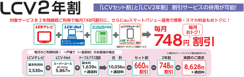 「エルシーブイ 2年割サービス(以下「2年割」という)」は、LCVテレビ、LCV-Netスーパーコース、ケーブルプラス電話を2年間継続してご利用いただくことを前提として、月々のご利用料を割引させていただくサービスです。