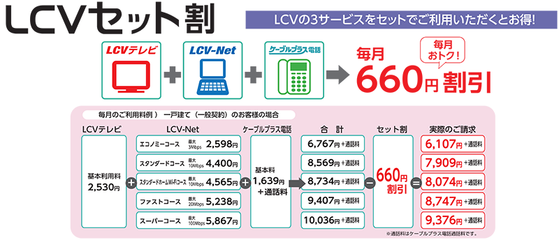 ※ 集合住宅・リゾート地区などで、管理者様を通じて LCV テレビのご利用料をお支払の場合もセット割をお申し込みいただけます。この場合、LCV-Net・ケーブルプラス電話の 2つのサービスの月々のご利用料から同額を割引させていただきます。