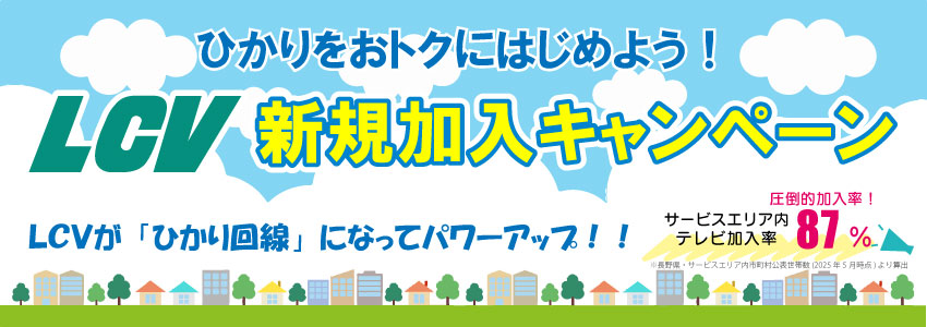 【対象】 | (1)「LCVひかりテレビ」・「LCVひかりインターネット」・「LCVひかり電話」3点セットで新規ご契約のお客様 (2)「LCVひかりテレビ」・「LCVひかり電話」2点セットで新規ご契約のお客様 ※別荘地区は対象外となります。 ※現在LCVテレビサービスをご利用中の方は対象外となります。 |
